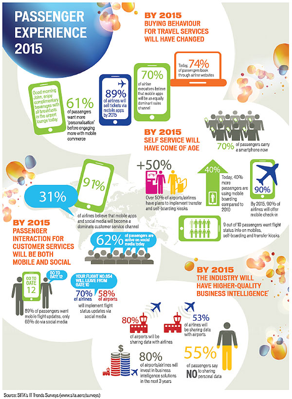 Один из мировых лидеров в области телекоммуникационных и ИТ-услуг для сектора воздушных перевозок – компания SITA, заявила что к 2015 году индустрия авиатранспорта не избежит значительных изменений благодаря новым современным инновациям, используемым авиакомпаниями, аэропортами и пассажирами. Это заявление компания SITA опубликованы в отчете под заголовком: «Полет в будущее» (Flying into the Future). В течение следующих трех лет кардинально изменятся способы приобретения туристических услуг и технологии самостоятельной регистрации. Кроме того, будет обеспечена полная поддержка приложений для мобильных устройств и социальных сетей благодаря тому, что авиакомпании и аэропорты оптимизируют свою работу и обеспечат качественно новый уровень обслуживания клиентов за счет сбора и обработки огромных объемов данных.