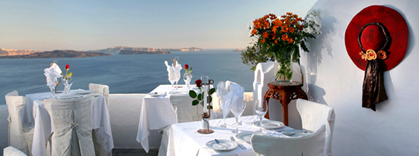 Ресторан расположен на греческом острове Санторини, который известен, как одно из самых красивых мест в мире, где можно наблюдать закат. Любование морем и закатом солнца, можно сочетать с прекрасной греческой кухней.