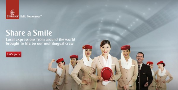Новую мультиязычную кампанию «Поделись улыбкой» («Share a Smile»), построенную на тонкостях перевода, запустила одна из самых динамично развивающихся авиакомпаний мира Emirates Airline. Для того чтобы объяснить смысл забавных и оригинальных выражений и приветствий, популярных в разных уголках мира, сотрудники Emirates Airline приняли участие в создание 29 видеороликов на 14 языках мира. Кампания была разработана Emirates Airline, чтобы помочь путешественникам преодолеть языковой барьер и делиться хорошим настроением с друзьями и знакомыми, просматривая и пересылая друг другу видеоролики.