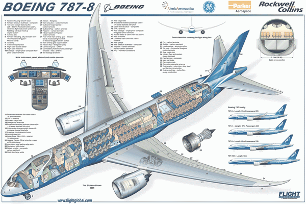 В новом Boeing-787 основные компоненты выполнены из легких композитных материалов, поэтому самолет отличается повышенной экономичностью: он потребляет топлива на 20% меньше аналогичных самолетов.